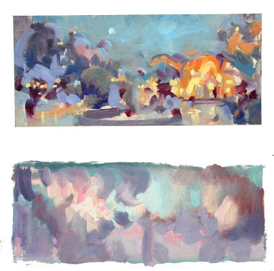 By this time I had established which of the paintings seemed worth working up to a larger size, and I developed those images a little more. These oil sketches are each about 1.5 x 4 inches. Juxtaposing the little sketches helped me to think of not only of the individual painting but also the adjacent sequences.-------